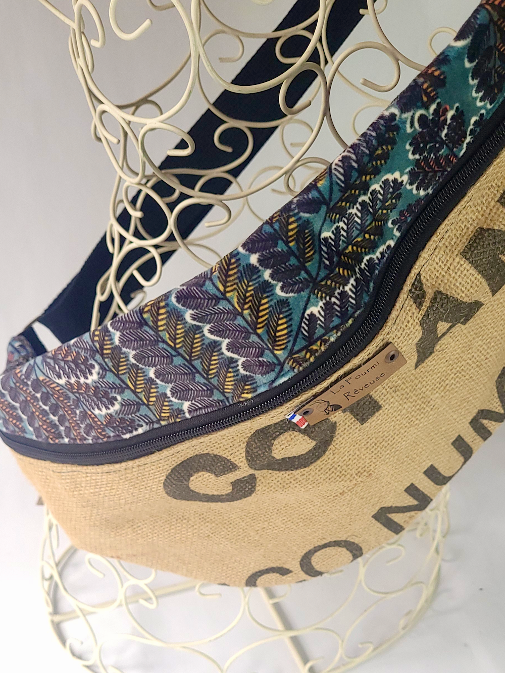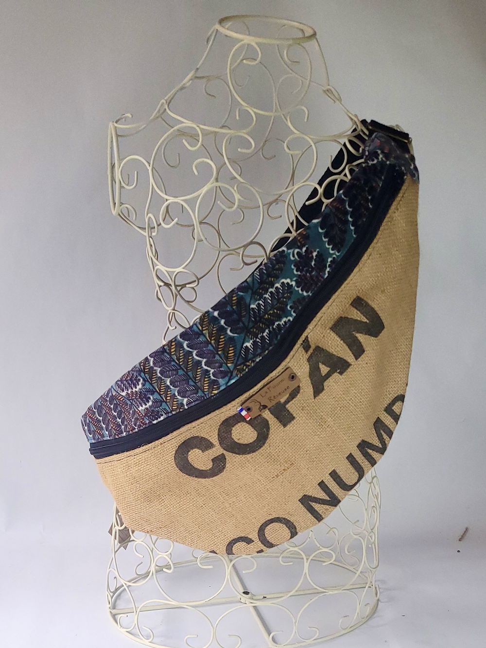 Affirmez votre style avec une pièce unique, durable et pleine de caractère : cette maxi banane est fabriquée à partir de sacs à café en toile de jute recyclés, conservant les impressions originales pour un look authentique. L’association avec des tissus en coton unis apporte une touche de douceur et de modernité.