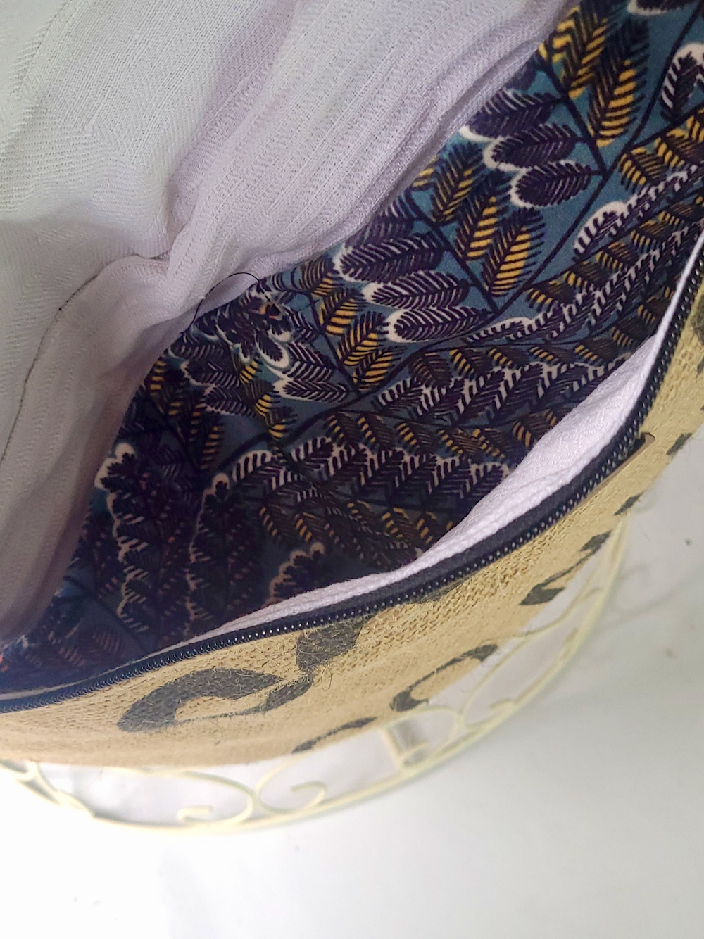 Extérieur : Toile de jute issue de sacs à café recyclés, avec impressions d’origine + tissu coton à motif